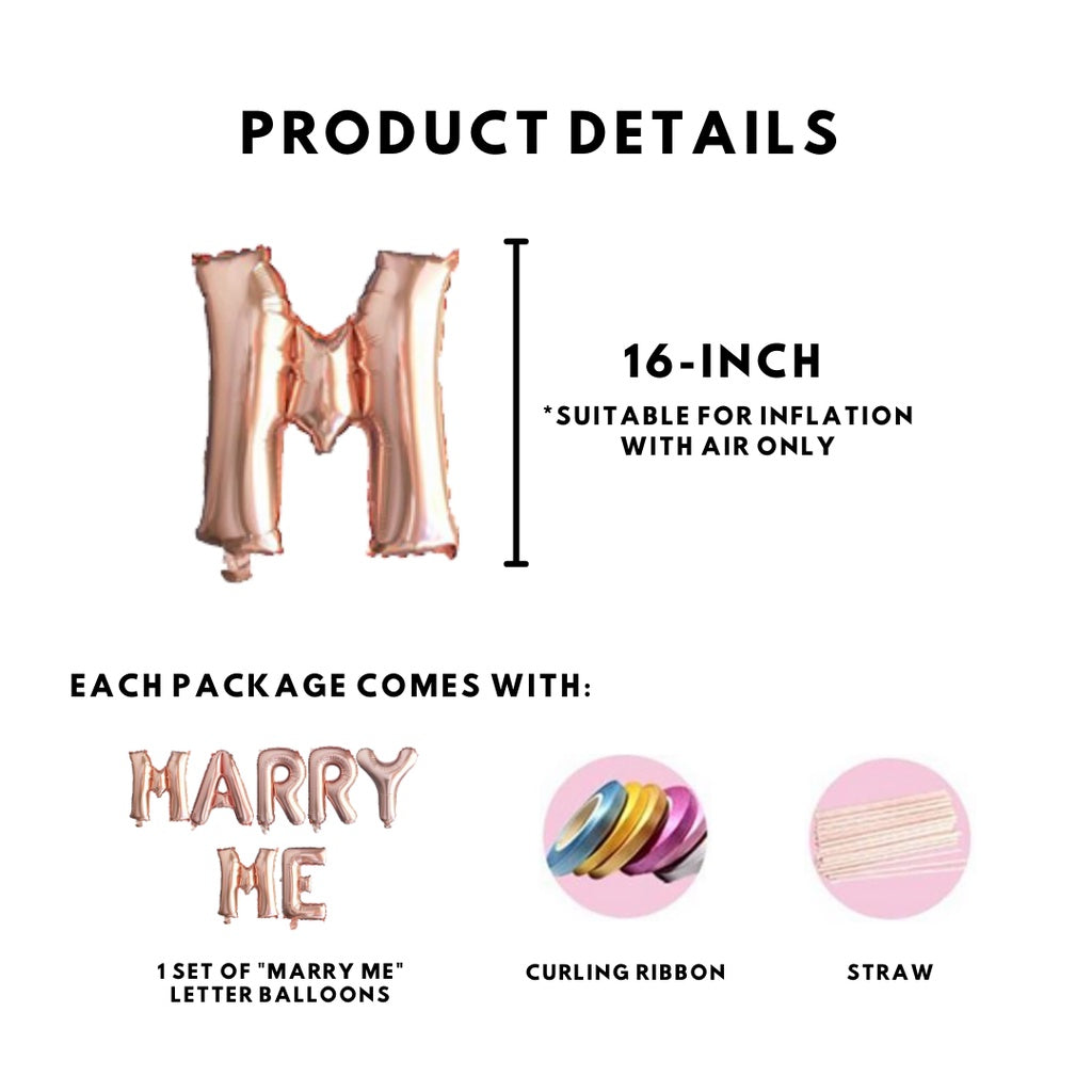 Each package comes with 1 set of "Marry Me" letter balloons, a straw to inflate the balloons up and a mini roll of ribbon.